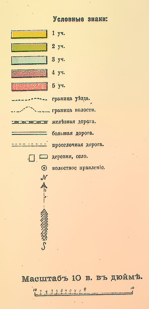 ![]() Карта масштаба 10 верст в дюйме. Из книги: "Адрес-календарь и справочная книжка Тамбовской губернии 1914 года".Условные обозначения