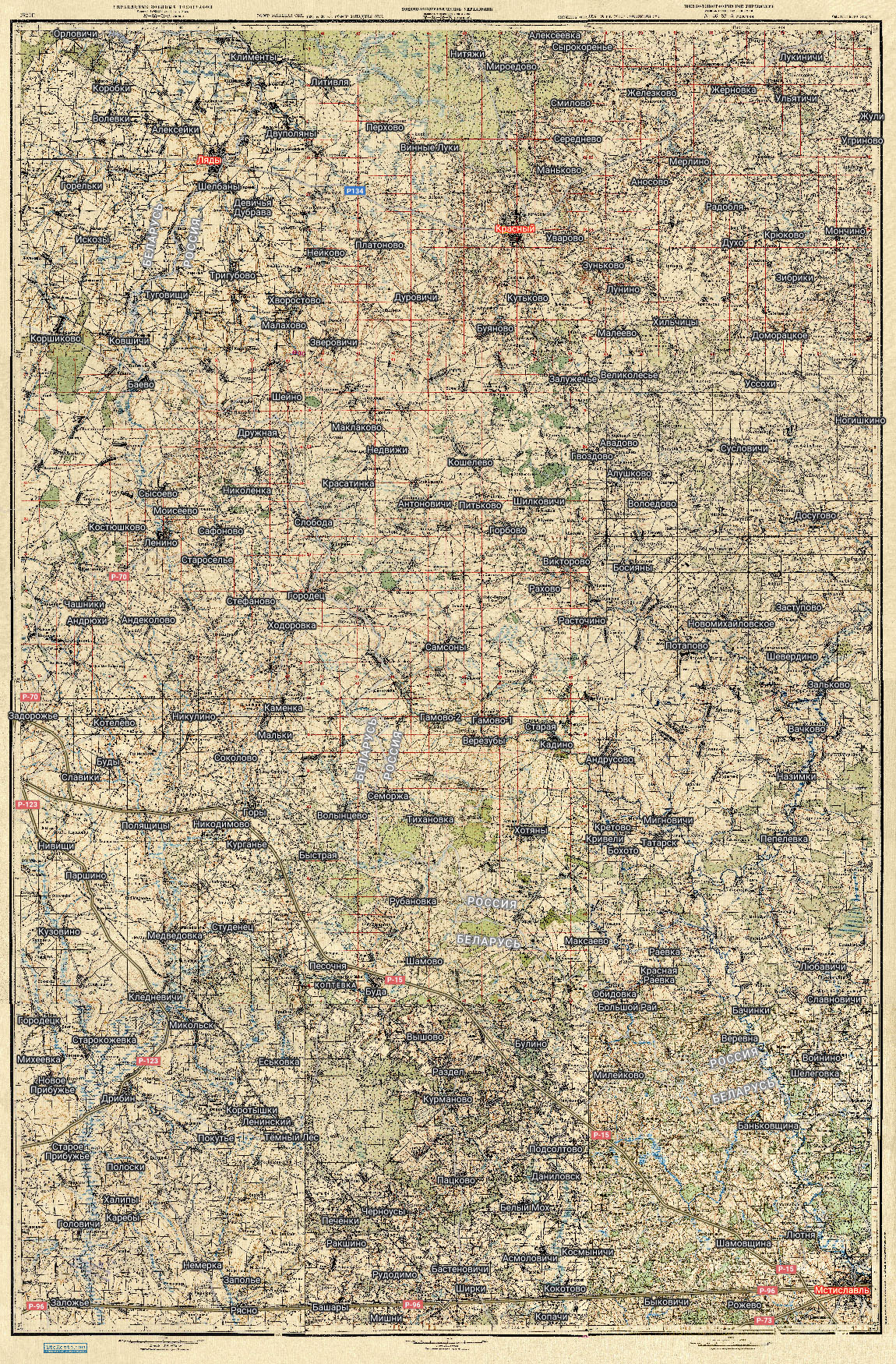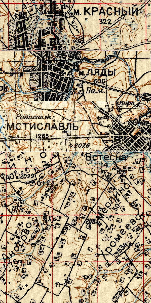 Сборная карта из 12 листов полукилометровок РККА: N-36-51-(А,Б,В,Г), N-36-52-(А,В), N-36-63-(А,Б,В,Г), N-36-64-(А,В). На карте показана территория вокруг таких населённых пунктов Смоленской области и Беларуси, как: Красный, Ляды, Мстиславль, Дрибин, Ленино, Горы, Паршино, Курманово, Раевск, Татарск и т.д.