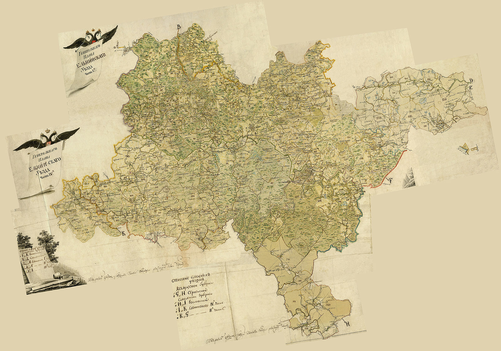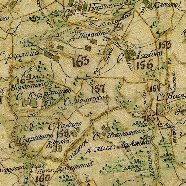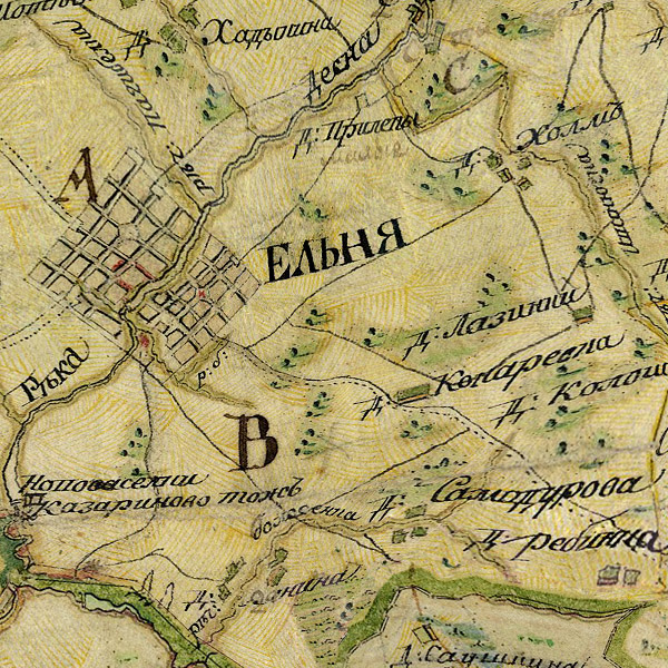 План Генерального Межевания Ельнинского уезда. Масштаб межевой карты - 2 версты в дюйме 1:84000. По данным межевания с 1776 года.