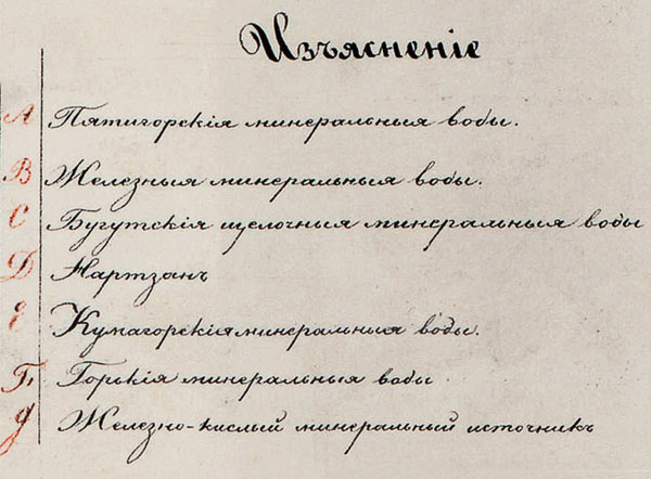 Топографическая карта окрестности города Пятигорска составлена в комиссии высочайше учрежденной для исследования и устройства Кавказских Минеральных Вод в 1842 году под председательством коллежского советника Гефта. Масштаб в английском дюйме 2.5 версты.