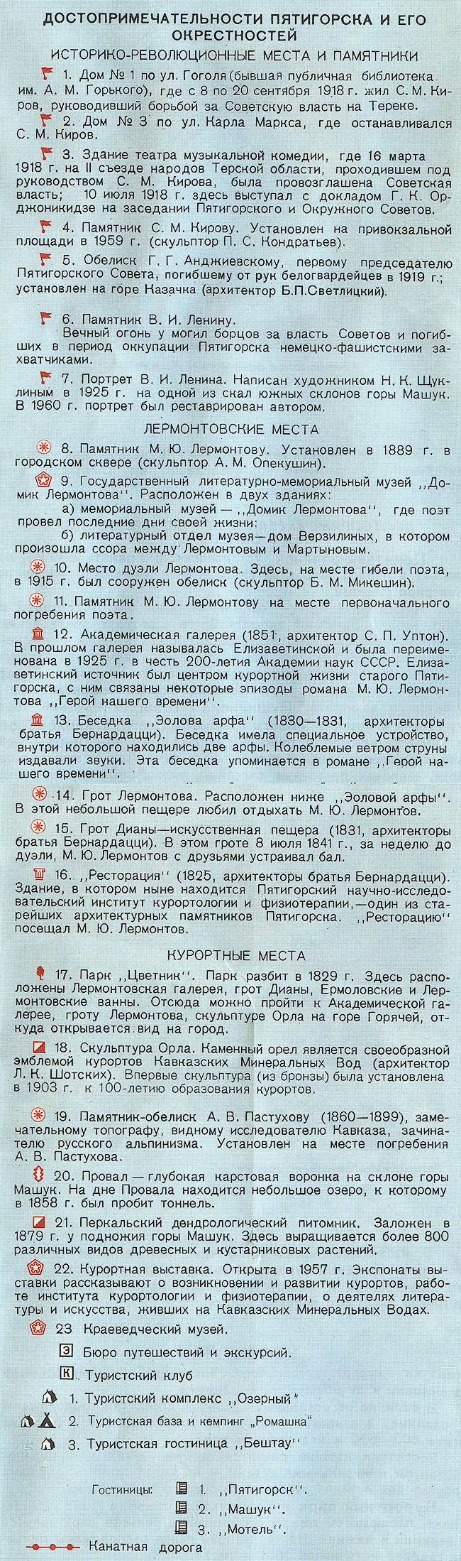 Пятигорск — самый большой и старейший бальнеологический курорт из группы Кавминвод, по разнообразию минеральных источников занимающий одно из первых мест в мире. Город раскинулся вдоль левого берега реки Подкумок, по южному и юго-западному склонам горы Машук и ее отрогу — горе Горячей, на высоте 500—550 м. ДОСТОПРИМЕЧАТЕЛЬНОСТИ ПЯТИГОРСКА И ЕГО ОКРЕСТНОСТЕЙ ПО ИСТОРИКО-РЕВОЛЮЦИОННЫМ МЕСТАМ ПАМЯТНИК С.М. КИРОВУ установлен на площади Кирова в 1959 г. Работа скульптора П.С. Кондратьева. МЕМОРИАЛЬНЫМИ ДОСКАМИ отмечены здания: а) дом №3 по улице Карла Маркса, где останавливался С.М. Киров; б) дом №1 по улице Гоголя. В бывшей гостинице "Эрмитаж", в номере 13, с 8 по 20 сентября 1918 г. жил С.М. Киров — организатор Советской власти на Тереке; в) здание театра музыкальной комедии. Здесь установлены две мемориальные доски. На одной из них написано, что в этом здании 14—17 марта 1918 г. на съезде народов Терской области, проходившем под руководством С.М. Кирова, была провозглашена Советская власть, на другой: "Здесь 10-7-1918 г. выступал Серго Орджоникидзе на объединенном заседании Пятигорского и Окружного Советов с докладом о ликвидации левоэсеровского мятежа в Москве". ОБЕЛИСК Г.Г. АНДЖИЕВСКОМУ находится на горе Казачка. Здесь 31 авг. 1919 г. белогвардейцами был казнен первый председатель Пятигорского Совдепа Анджиевский. Автор обелиска местный архитектор Б.П. Светлицкий. ПОРТРЕТ В.И. ЛЕНИНА НА СКАЛЕ ГОРЫ МАШУК выполнен художником Н.К. Шуклиным в июле 1925 г. в подарок Первому съезду горянок и терских казачек, проходившему в Пятигорске с 18 по 25 июля 1925 г. Портрет обновлен художником в 1960 г. ПАМЯТНИК А.В. ПАСТУХОВУ (1860—1899) — военному топографу и альпинисту, известному своими восхождениями на вершины Кавказа и их топографическими съемками. Обелиск установлен недалеко от вершины г. Машук, на его южном склоне. КРАЕВЕДЧЕСКИЙ МУЗЕЙ (ул. Сакко и Ванцетти, 1). Музей организован в 1905 г. В залах музея выставлено около 3-х тыс. экспонатов (всего собрано около 40 тыс.). В музее три отдела: природы, истории дореволюционного прошлого и истории советского периода. ПО ЛЕРМОНТОВСКИМ МЕСТАМ ЛИТЕРАТУРНО-МЕМОРИАЛЬНЫЙ МУЗЕЙ "ДОМИК ЛЕРМОНТОВА" расположен в двух зданиях. В доме, где поэт провел последние дни своей жизни, организован мемориальный музей. В доме Верзилиных, в котором произошла ссора между Лермонтовым и Мартыновым, создан литературный отдел музея. ПАМЯТНИК М.Ю. ЛЕРМОНТОВУ установлен в 1889 г. в городском сквере. Автор памятника известный скульптор А.М. Опекушин. МЕСТО ДУЭЛИ ЛЕРМОНТОВА у северного подножия Машука (условное место — точное место дуэли не установлено). Здесь в 1915 г. сооружен обелиск работы скульптора Б.М. Микешина. В центре обелиска — горельеф Лермонтова. МОГИЛА М.Ю. ЛЕРМОНТОВА. На городском кладбище сооружен памятник на месте первоначального погребения поэта. АКАДЕМИЧЕСКАЯ ГАЛЕРЕЯ — бывшая Елизаветинская галерея (постройки 1850 г., проект архитектора С.П. Уптона), переименованная в 1925 г. в честь 200-летия Академии наук СССР. Елизаветинский источник был центром курортной жизни Пятигорска. С ним связаны некоторые эпизоды романа М.Ю. Лермонтова "Герой нашего времени". В настоящее время здесь имеются питьевые бюветы двух минеральных источников. "ЭОЛОВА АРФА". На вершине горы Горячей находится беседка "Эолова арфа", сооруженная в 1830 — 1831 гг. архитекторами братьями Бернардацци. Н