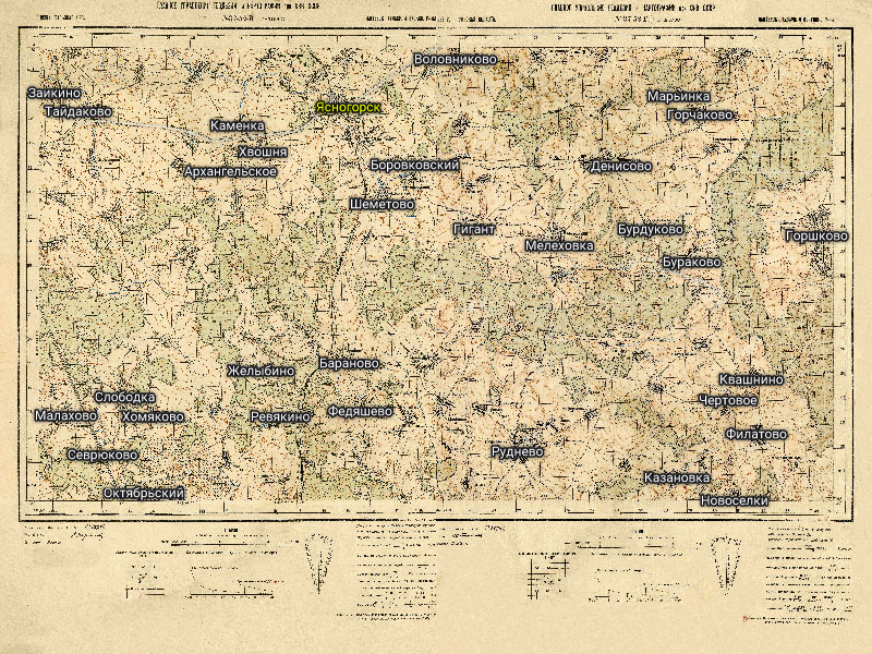 Сборная карта из 2 листов полукилометровок РККА: N-37-52-В и N-37-52-Г. На карте показана территория вокруг таких населённых пунктов Тульской области, как: Ясногорск (в прошлом Лаптево), Тайдаково, Архангельское, Денисово, Бураково, Ревякино, Анишино и т.д.