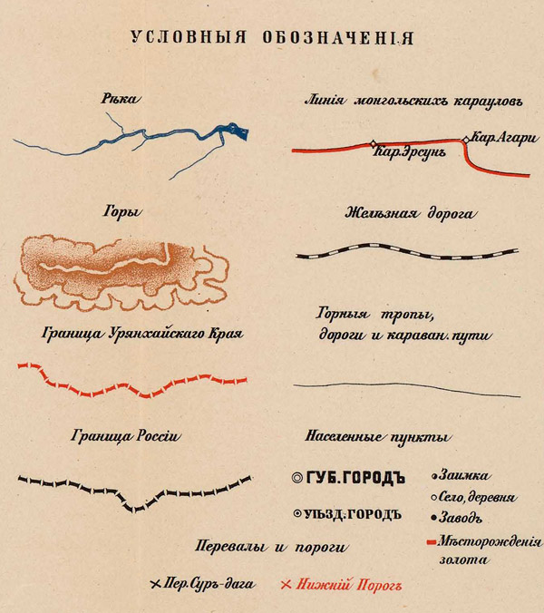 ![]() Оригинальное название: "Карта бассейна верхней части реки Енисея". Составлена по карте военно-топографического управления 1887-1891 г. и новым географическим данным. Масштаб 40 верст в дюйме. Исполнил в 1908 году техник А. Быков. Картографическое заведение Д. Руднева. Из книги "Очерк Урянхайского края", составленной инженером путей сообщения В. Родевичем, начальником партии исследования системы верхнего Енисея.Условные обозначения