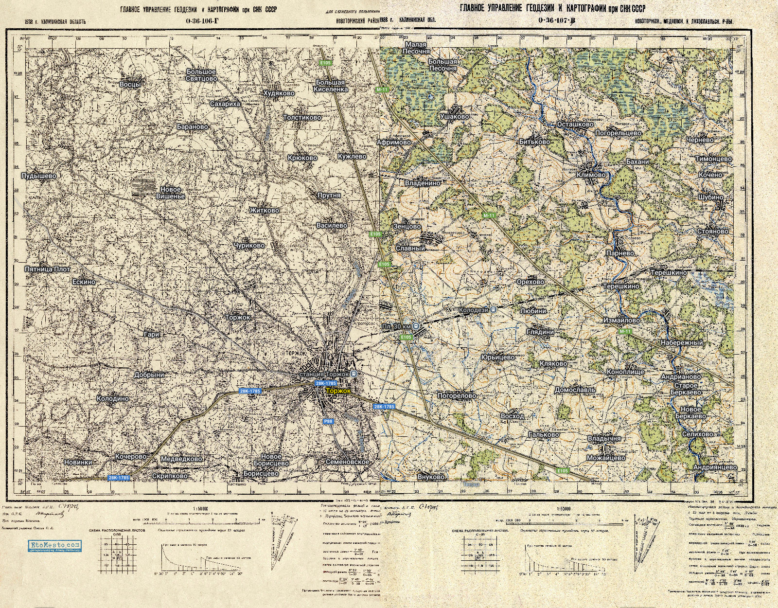 Сборная карта из 2 листов полукилометровок РККА: O-36-106-Г и O-36-107-В, на которых показана территория вокруг города Торжок Тверской области.