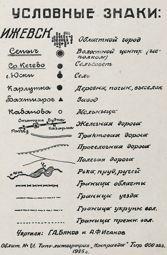 Схематическая карта Ижевского уезда Вотской Автономной Области. Часть карты, составленной Вятским губернским оценочно-статистическим отделением. Исправлена и дополнена Вятским статистическим бюро по материалам 1924 г. Издание Вотского издательства "Удкнига". Масштаб 3 версты в дюйме. На 6 листах. Чертили: Г.А. Бяков и А.Ф. Исаков. Тираж 600 экз., типо-литография "Ижправда".
