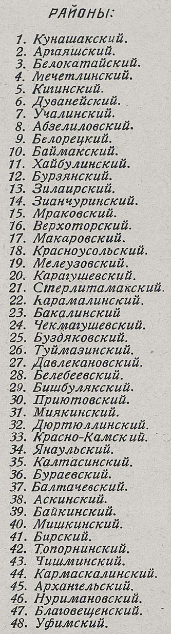 Учебное пособие для школ БАССР. Тираж 10000 экз. Автор В.Д. Таич. Размер 31x41 см. Литография "Октябрьский натиск". Масштаб 20 км. в 1 см. Цифрами обозначены районы.