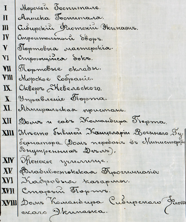 План города Владивостока составлен с плана переданного контр-адмиралом Ермолаевым й 1892 году. Показано расположение казённых зданий морского ведомства. Масштаб 50 саженей в дюйме. Исправлял и дополнял с натуры в сентябре 1895 года землемером А. Машковцевым.