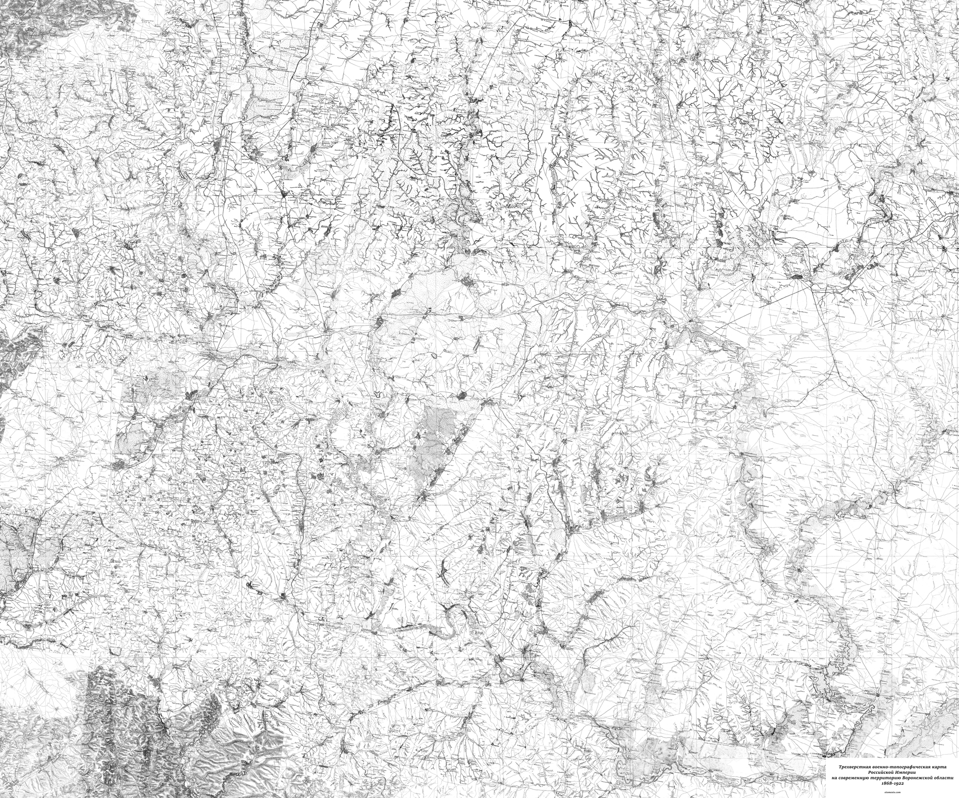 Так называемая "карта Шуберта", трехверстная Военно-топографическая карта на территорию нынешней Воронежской области, в прошлом Воронежской губернии. Карта отражает состояние местности по исследованиям 1868 - 1922 годов. Масштаб: в 1 см. 1.26 км. Привязка осуществлена с учетом коррекции на местность.