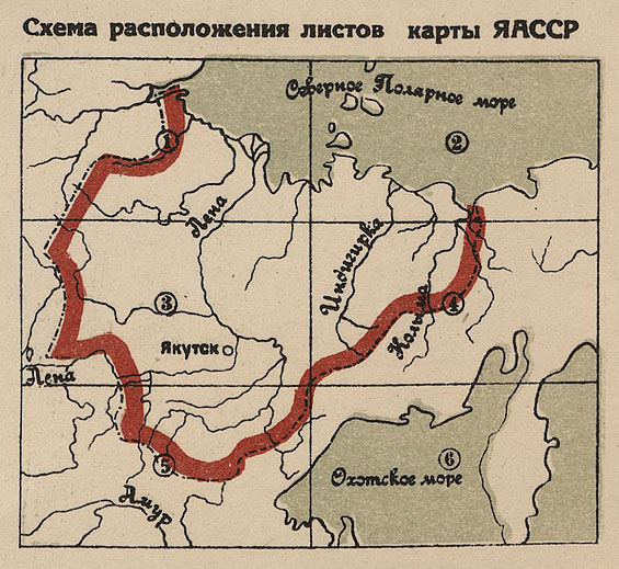 Карта Якутской ССР на 6 листах издания Всесоюзного Картографического треста ГГУ-НКТП СССР, Академия наук СССР, совет по изучению производственных сил. Масштаб в 1 см. 20 км.