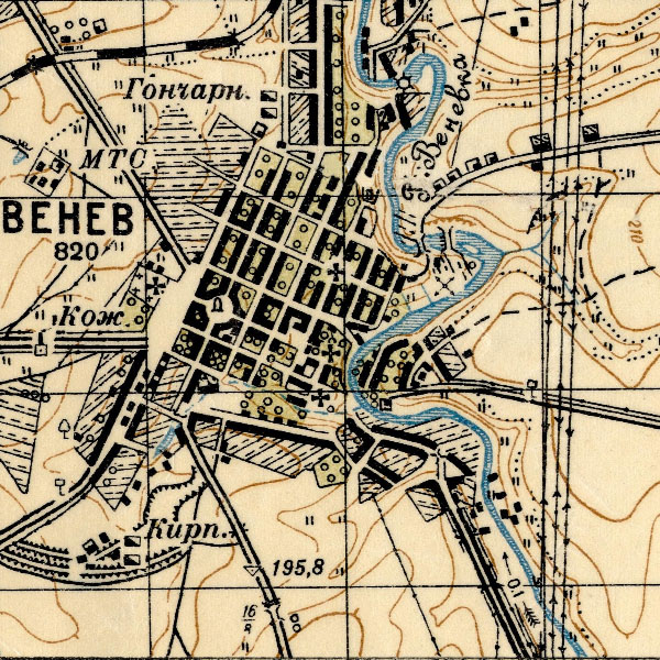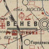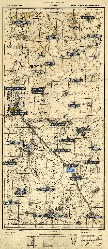 Сборная карта из 2 листов полукилометровок РККА: N-37-53-Г, N-37-65-Б. На карте показана территория вокруг таких населённых пунктов Тульской области, как: Венёв, Брозденки, Исаково, Борщево, Причаль, Курмышки, Гати, Медведки, Грибовка, Урусово, Холтобино и т.д.